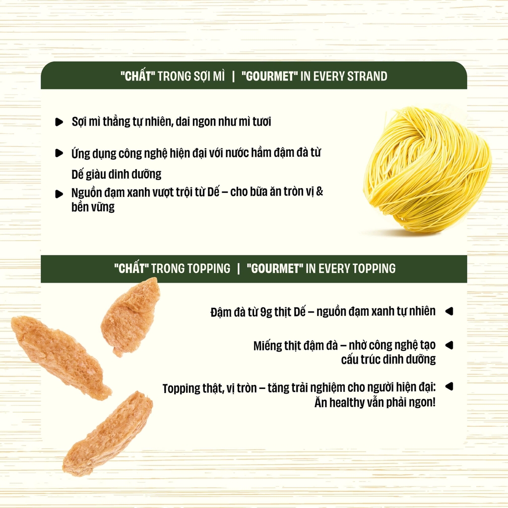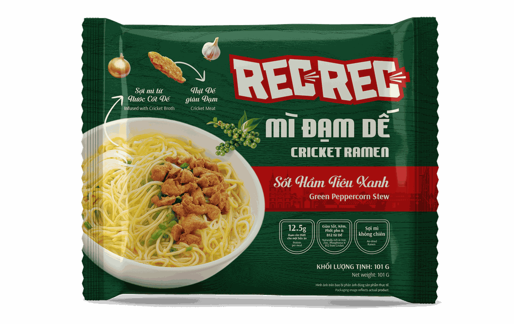 Mì Đạm Dế - Vị Sốt Hầm Tiêu Xanh ✨ Đậm đà – Cay dịu – Như bữa cơm nhà ngày mưa Mì Đạm Dế Rec Rec là dòng mì ăn liền cao cấp kết hợp giữa tiện lợi và dinh dưỡng, với nguồn đạm tự nhiên từ Dế – chứa 12.5 gram Đạm, các amino axit và khoáng chất cần thiết. Sản phẩm mang đến trải nghiệm ẩm thực hiện đại qua 4 hương vị lấy cảm hứng từ Á đến Âu. Sợi mì màu vàng tự nhiên, topping đầy đặn, tạo cảm giác no tròn và thật vị. Vị tiêu xanh ấm nồng, hòa quyện cùng sốt hầm đặc sánh như đánh thức ký ức những ngày lành lạnh. Cảm hứng từ món thịt hầm truyền thống, gói trọn tinh thần “comfort food” Việt trong từng sợi mì. 💪 “Chất” trong sợi mì - Sợi mì thẳng tự nhiên, dai ngon như mì tươi - Ứng dụng công nghệ hiện đại, với nước hầm đậm đà từ Dế giàu dinh dưỡng - Nguồn đạm xanh vượt trội từ Dế - cho bữa ăn tròn vị và bền vững 💪 “Chất” trong topping - Đậm đà từ 9 gram thịt Dế - nguồn đạm xanh tự nhiên - Miếng thịt đậm đà - nhờ công nghệ tạo cấu trúc dinh dưỡng - Topping thật, vị tròn - tăng trải nghiệm cho người hiện đại: Healthy nhưng vẫn phải ngon 👩🍳 Hướng dẫn sử dụng - Đun sôi 450ml nước - Khi nước sôi cho mì vào nấu và đảo nhẹ - Sau 2 phút, cho topping vào nấu cùng để topping nở mềm - Tiếp tục nấu thêm 2 phút ✅ Phương pháp nấu mì nước - Tắt bếp và cho các gói gia vị vào - Trộn đều và thưởng thức khi còn nóng hổi ✅ Phương pháp nấu mì trộn - Chắt và để lại một ít nước - Cho các gói gia vị vào, trộn đều và thường thức ngay Xuất xứ: Việt Nam Trọng lượng: 101g/gói Ngày sản xuất: In trên bao bì Độ đạm : 12.1g HSD : 9 tháng Hướng dẫn bảo quản: Bảo quản nơi khô ráo, thoáng mát, tránh ánh nắng trực tiếp. Nên chế biến ngay sau khi mở bao bì ⚠️ KHUYẾN CÁO: Thận trọng với người có tiền sử dị ứng động vật thân giáp (tôm, cua ...)